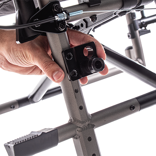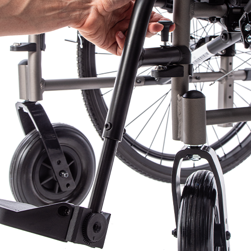 El centro de gravedad puede modificarse fácilmente mediante la platina de la rueda trasera Ø60 cm. Al desplazarla hacia atrás, la silla se vuelve más pasiva y el centro de gravedad queda más adelantado respecto al eje.