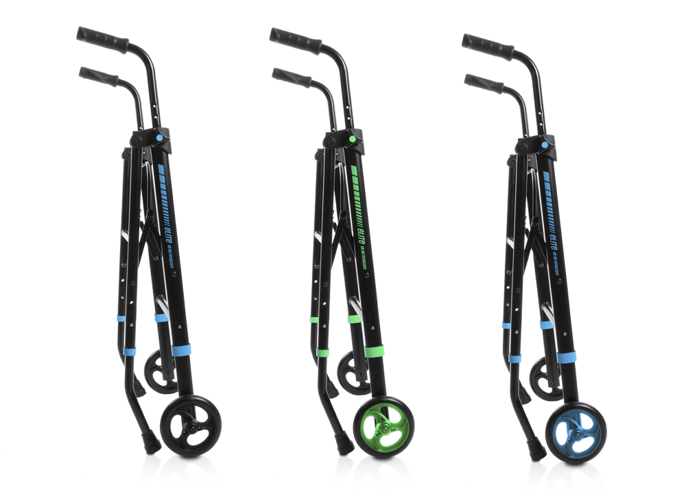 El andador Elite 1G ofrece la opción de elegir entre tres colores de ruedas y vinilos distintos: negro, azul y verde. Cualquiera de estas opciones es ideal para personalizar su experiencia de paseo con el Elite.