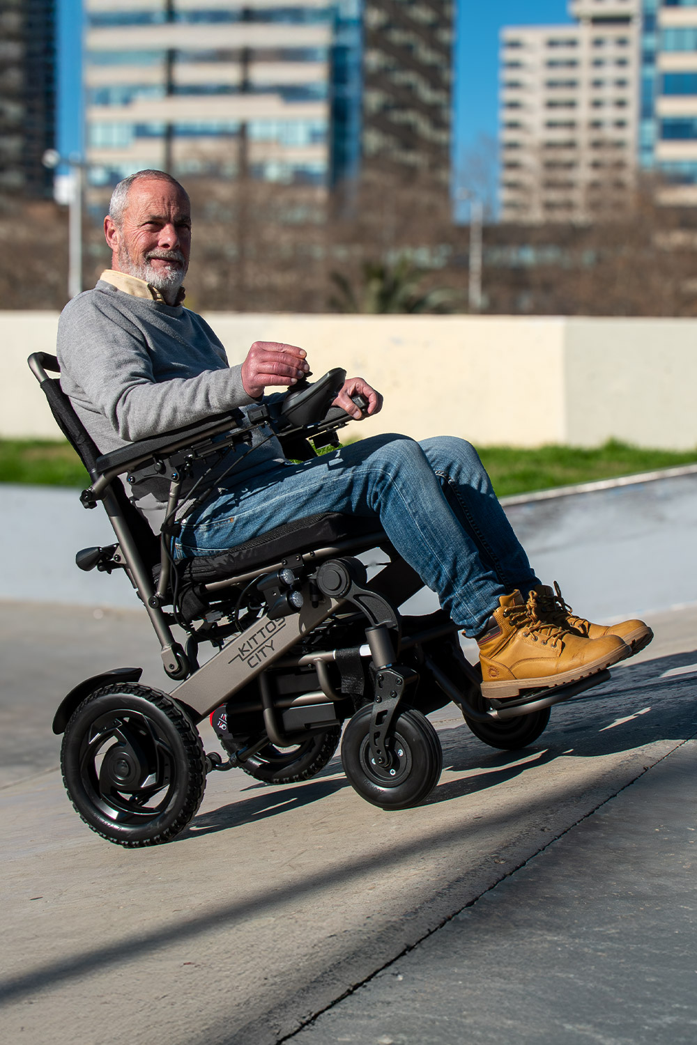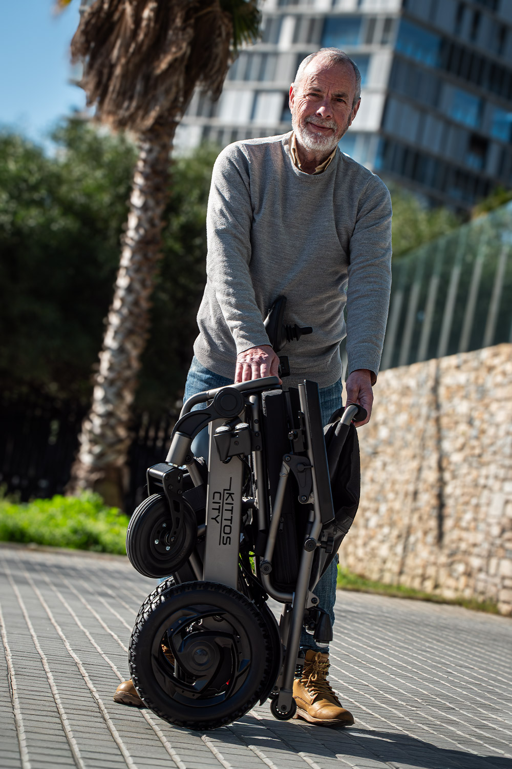 Le Kittos City dispose de deux roues intégrées qui simplifient le transport du fauteuil lorsqu'il est plié, fonctionnant comme un chariot pratique. Sa portabilité est extrêmement confortable. De plus, ces roues font l'objet d'un brevet enregistré sous le numéro ES 1231189U.
