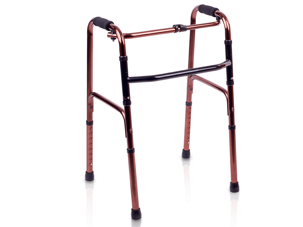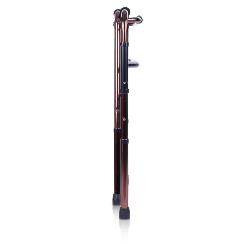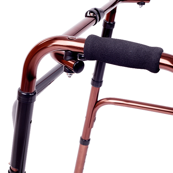 Disponível numa elegante cor de cobre e com pegas revestidas a neopreno para maior conforto. Com um peso total de 2,20 kg, este andarilho é capaz de suportar até 100 kg de peso máximo.
