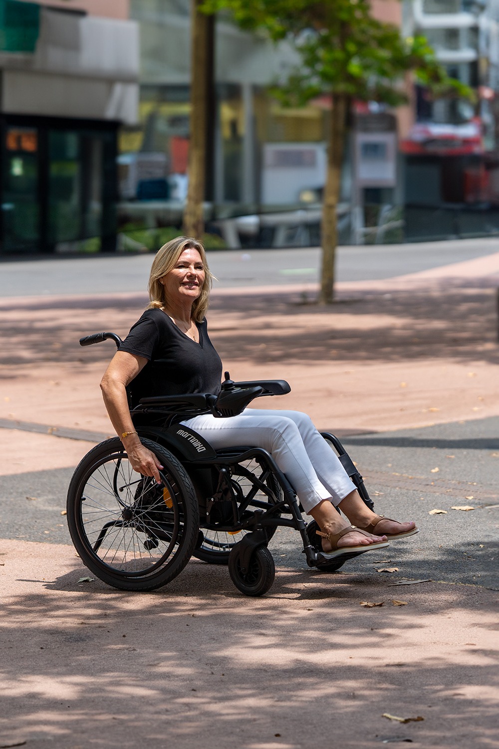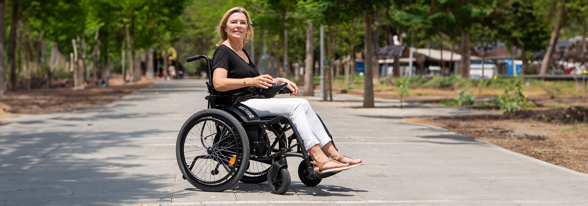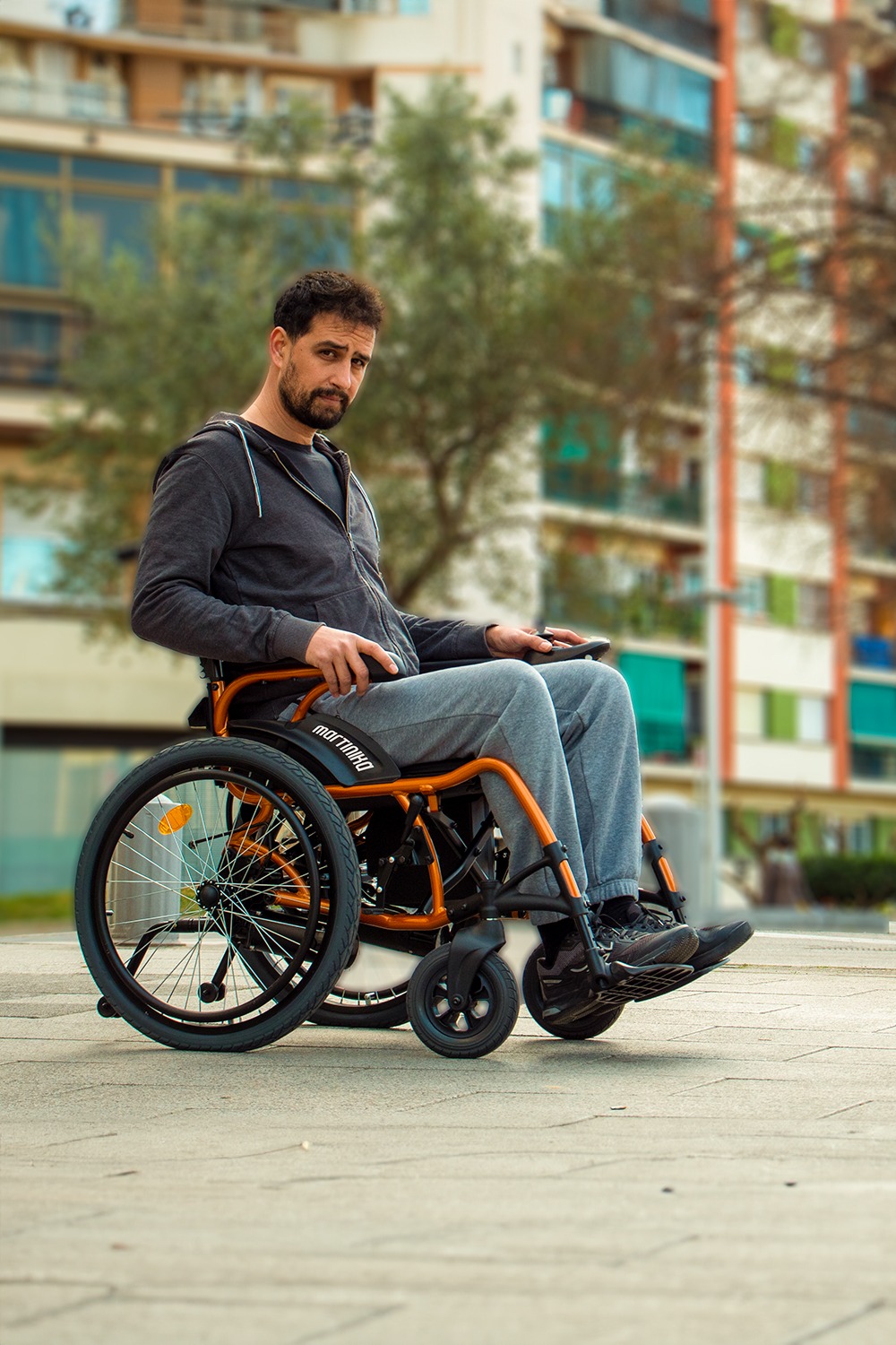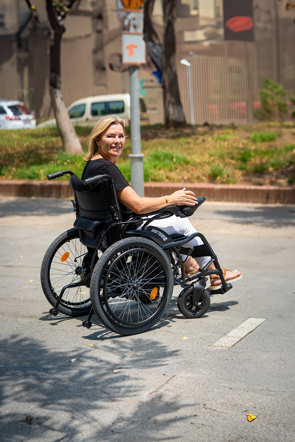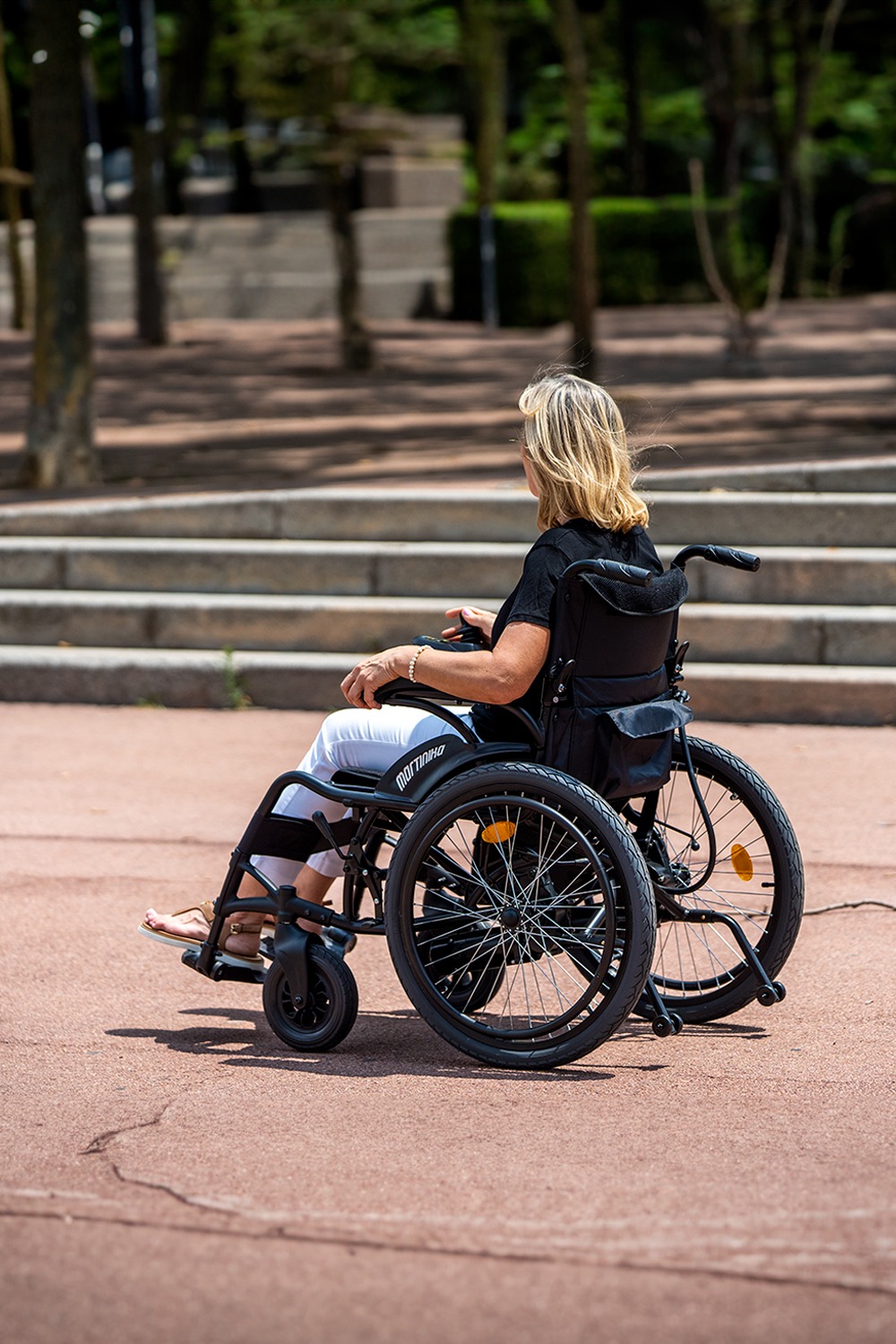 La Martinika Impulse está equipada con ruedas traseras de gran diámetro, Ø54 cm, que brindan al usuario la capacidad de desbloquear el motor y utilizarla como una silla de ruedas manual sin encontrar resistencia. Esta innovación revolucionaria permite al usuario alternar entre el uso de una silla de ruedas eléctrica y una silla manual de manera conveniente y sin esfuerzo.